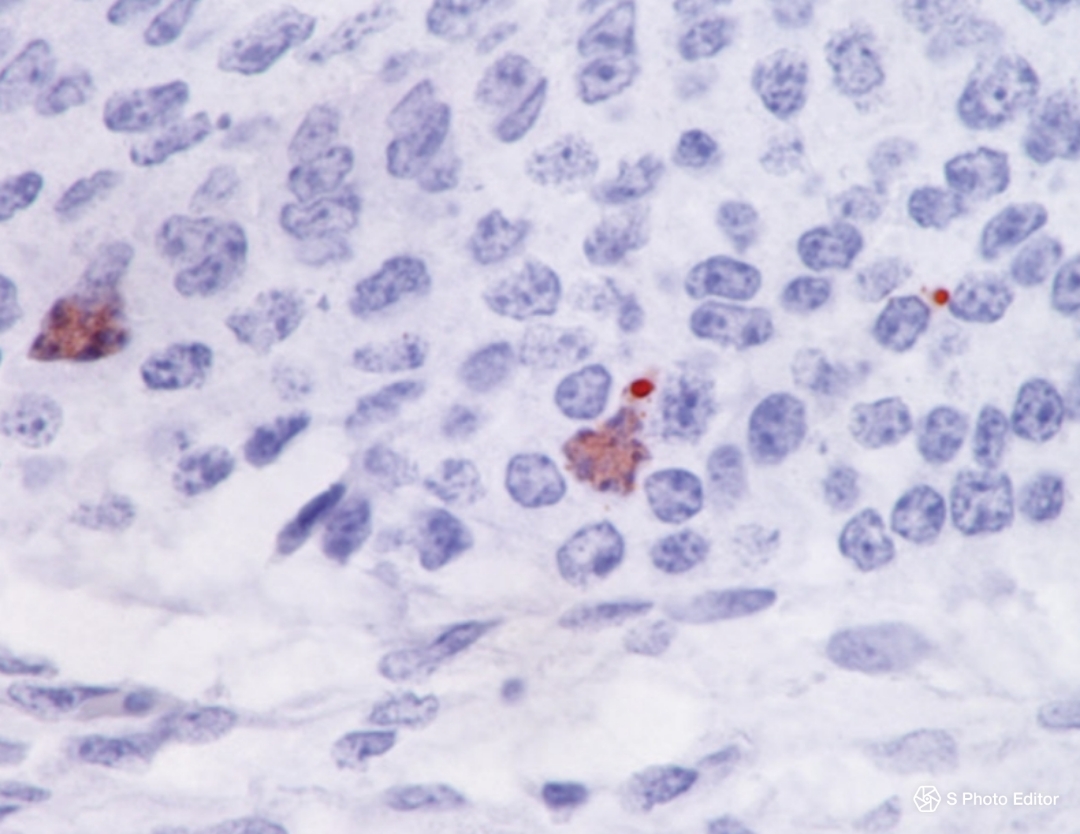 Gambar 5b. Dengan pewarnaan imunohistopatologi agen penyakit ditemukan di otak ayam (kiri)