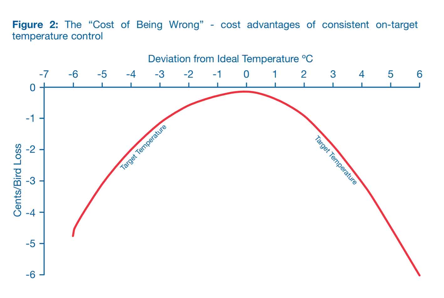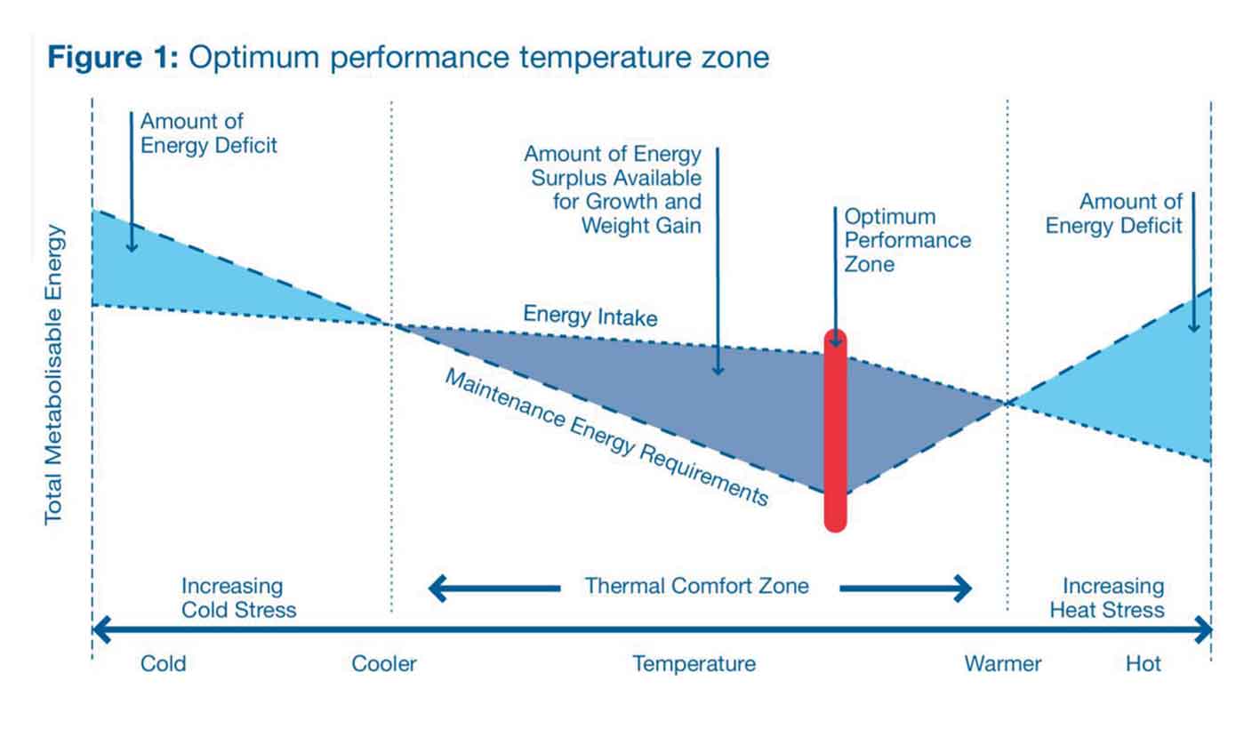 Pada setiap tahap pertumbuhan, ayam broiler memiliki zona kenyamanan yaitu rentang suhu yang sempit di mana ayam dapat memanfaatkan pakan secara optimal untuk pertumbuhan. “Zona termoneutral” ini berubah seiring pertumbuhan ayam (sekitar 30°C saat DOC masuk kandang hingga mendekati 20°C menjelang panen). Oleh karena itu, ventilasi dan pemanasan harus terus disesuaikan sepanjang periode pemeliharaan agar sesuai dengan kebutuhan ayam.
