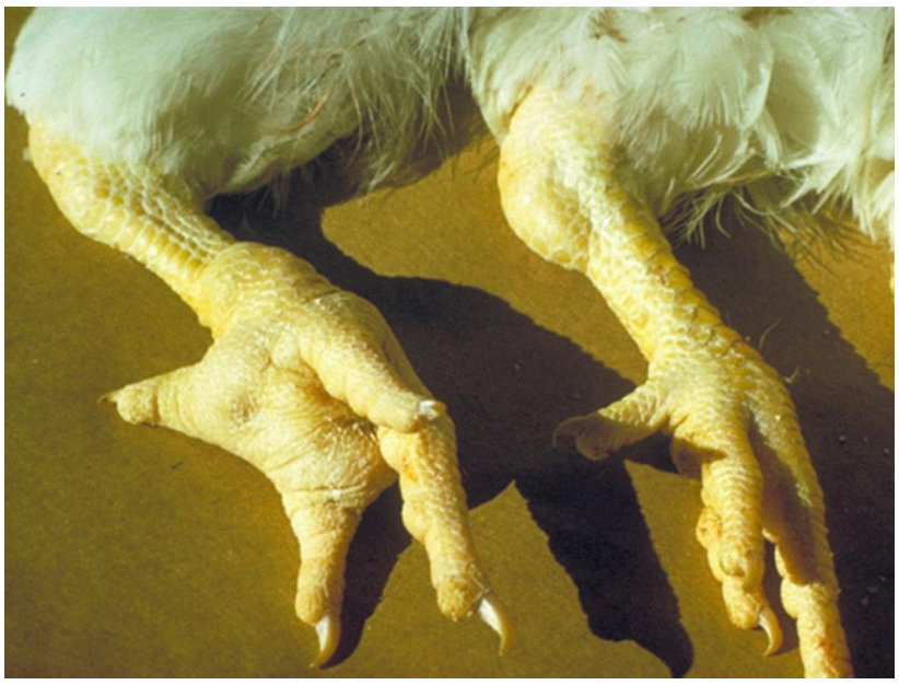 Gambar 2 Pembengkakan pada persendian lutut (hock joints) dan jari kaki (toe joints) akibat infeksi Ms (American Association of Avian Pathologists.)