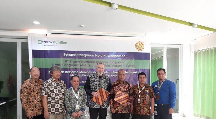 POULTRYINDONESIA, Bekasi - PT Trouw Nutrition Indonesia melakukan penandatanganan nota kesepahaman (MoU) dengan Balai Pengujian Mutu dan Sertifikasi Pakan (BPMSP) di Kantor Pusat PT Trouw Nutrition Indonesia, Bekasi, Selasa (3/12).