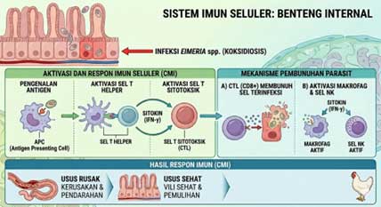 Biosekuriti adalah pondasi utama pertahanan eksternal. Namun, jika parasit tetap lolos, sistem imun seluler menjadi benteng internal ayam untuk melawan koksidiosis. Seperti pada gambar 3, sel-sel imun (seperti Sel T dan Makrofag) bekerja spesifik menghancurkan sel usus yang terinfeksi Eimeria spp., sehingga memutus siklus hidup parasit dari dalam. Agar sistem pertahanan internal ini tangguh, faktor penentu utamanya adalah nutrisi, khususnya asupan protein. Protein menyediakan asam amino esensial sebagai bahan baku utama pembentukan sel-sel imun tersebut. Kombinasi biosekuriti ketat (Sistem Ring) di luar dan asupan protein berkualitas di dalam adalah kunci ganda mencetak ayam bebas koksidiosis.